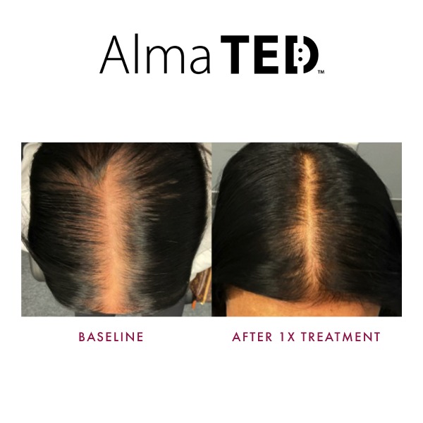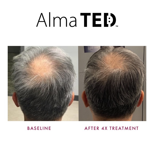 TED是 Trans Epidermal Delivery的縮寫。Alma TED是一種無痛、無針、無麻醉或鎮靜劑、非侵入手術,利用聲波和溫和的氣壓,改善了血液流動,並經由表皮將生長因子、胜肽、營養物質的專有菁華液輸送到頭皮中,最深可達 4mm,用以刺激頭髮生長。只要毛囊還未萎縮,也就是脫髮區域的頭皮不是已經呈現光亮的狀態下,幾乎所有類型的脫髮患者都可以從聲波療法中受益,Alma TED甚至可以應用在鬍鬚與眉毛的生長