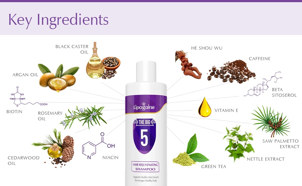 Big 5 shampoo蒐集近20種所有最佳天然護髮成份,幾乎能想到的天成份都添加進去,其中包括茶樹、摩洛哥堅果油、依蘭、椰子油、荷荷巴油、生物素、黑蓖麻油、Nigella Sativa 油、印度醋栗、咖啡因、蕁麻提取物、鋸棕櫚提取物、雪松油、迷迭香油、綠茶、鼠尾草油、何首烏、檸檬油、木槿提取物…等。而所謂的Big 5指的是生物素、咖啡因、摩洛哥堅果油、蓖麻油、鋸棕櫚,這些重要成份提供一個讓頭髮健康生長的頭皮環境、也可以減少DHT所造成的傷害。